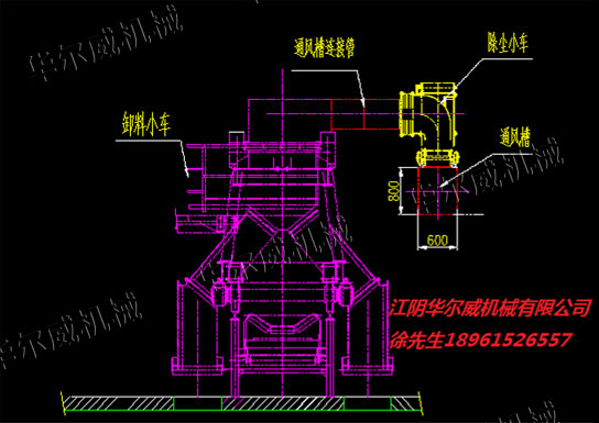卸料小車的一側(cè)設(shè)置移動除塵通風裝置,抽風風管與溜槽并排安裝,一頭對準槽口抽風,另一頭與移動除塵通風裝置的移動除塵小車相連,卸料小車在哪兒卸料,抽風風管便在哪兒抽風,含塵氣流由移動除塵小車進入通風槽,通過風管進入除塵器。